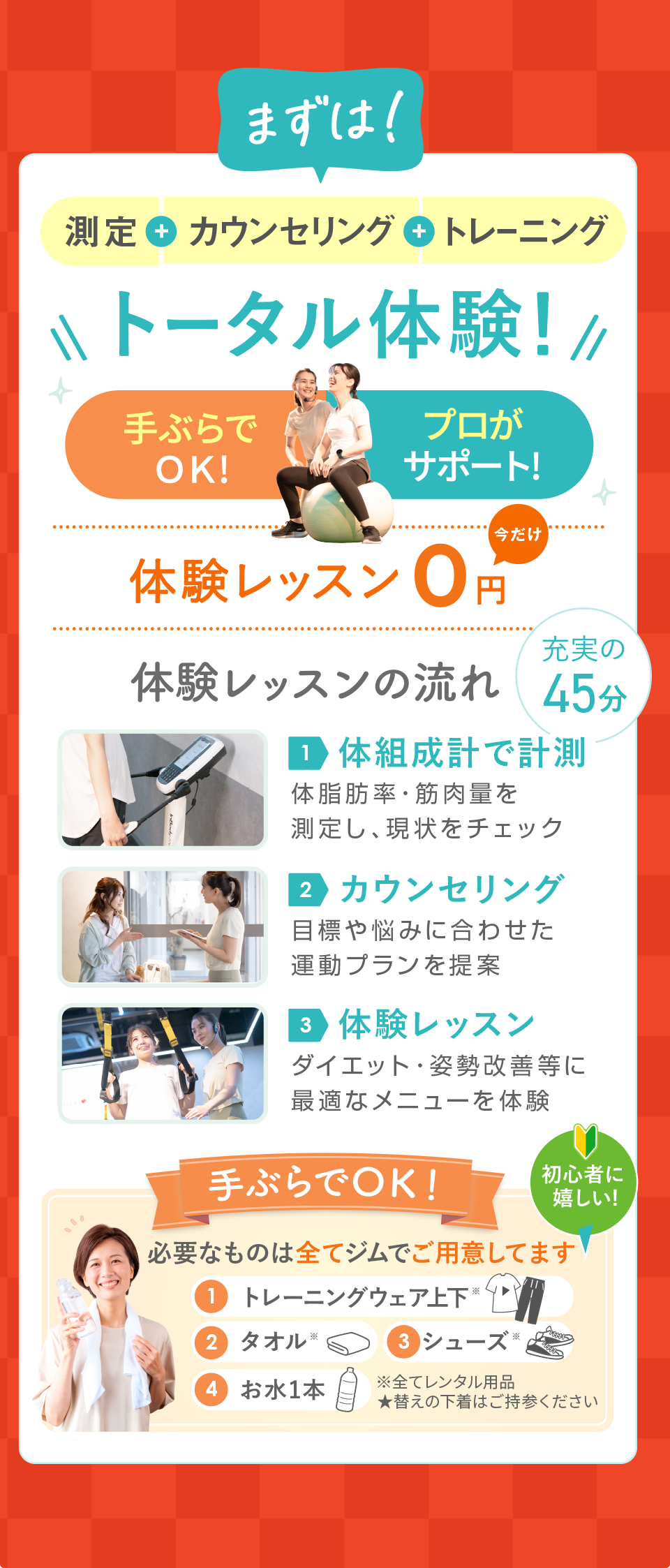 約8割の方がトレーニング経験のない方です。はじめての方でも丁寧に指導しますので、ご安心ください。まずはお気軽に体験レッスンにお越しください。