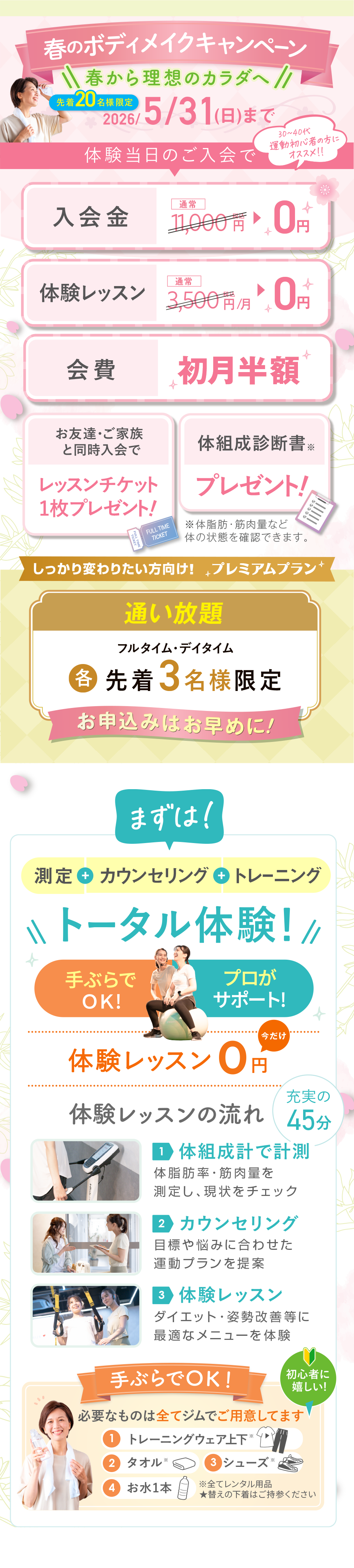 お着換え時間も含め体験レッスンの15分程前にお越しください。体験レッスン後にも10~20分程カウンセリングのお時間を予定しています。